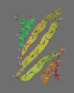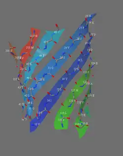 All beta-barrels can be classified in terms of two integer parameters: the number of strands in the beta-sheet, n, and the "shear number", S, a measure of the stagger of the strands in the beta-sheet.[3] These two parameters (n and S) are related to the inclination angle of the beta strands relative to the axis of the barrel.[4][5][6]