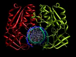 - 1 2 Pingoud A, Jeltsch A (September 2001). "Structure and function of type II restriction endonucleases". Nucleic Acids Research. 29 (18): 3705–27. doi:10.1093/nar/29.18.3705. PMC 55916. PMID 11557805.
