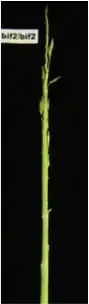 Phenotypes Mutations in the gene produce plants where tassels, or male inflorescences have fewer branches, spikelets, florets and floral organs. The ear shoot or female inflorescence, if it forms, has very few kernels. Natural variations of the bif2 gene have been found to affect tassel branch number and plant height (Pressoir et al 2009)[5]