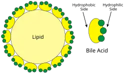 Bile or gall acts to some extent as a surfactant, helping to emulsify the lipids in food. Bile salt anions are hydrophilic on one side and hydrophobic on the other side; consequently, they tend to aggregate around droplets of lipids (triglycerides and phospholipids) to form micelles, with the hydrophobic sides towards the fat and hydrophilic sides facing outwards.[6] The hydrophilic sides are negatively charged, and this charge prevents fat droplets coated with bile from re-aggregating into larger fat particles. Ordinarily, the micelles in the duodenum have a diameter around 1–50 μm in humans.[7]