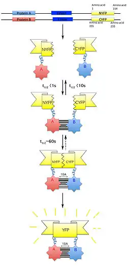 Unlike many in vivo protein-interaction assays, BiFC does not require protein complexes to be formed by a large proportion of the proteins or at stoichiometric proportions. Instead, BiFC can detect interactions among protein subpopulations, weak interactions, and low expression proteins due to the stable complementation of the fluorescent reporter protein.[12][17] In addition, successful fluorescent protein reconstitution has been reported for protein partners over 7 nm apart, so long as the linkers binding the fluorophore fragment to the protein of interest has the flexibility needed to associate with its corresponding fragment.[14] Furthermore, the strength of the protein interaction can be quantitatively determined by changes in fluorescent signal strength.[2]