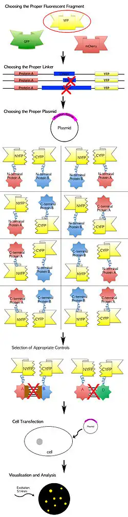 When designing plasmid vectors to express the proteins of interest, the construct must be able to express proteins that are able to form fusion proteins with fluorescent protein fragments without disrupting the protein's function. In addition, the expected protein complex must be able to accept stabilisation of the fluorescent protein fragment interaction without affecting the protein complex function or the cell being studied. Many fluorescent protein fragments that combine in several ways can be used in BiFC.[8][13] Generally, YFP is recommended to serve as the reporter protein, cleaved at residue 155 (N-terminal consisting of residues 1–154 and C-terminal consisting of residues 155–238) or residue 173 in particular, as these sets of fragments are highly efficient in their complementation when fused to many interacting proteins and they produce low levels fluorescence when fused to non-interacting proteins. It is suggested that each target protein is fused to both the N- and C-terminal fragments of the fluorescent reporter protein in turn, and that the fragments are fused at each of the N- and C-terminal ends of the target proteins. This will allow a total of eight different permutations, with interactions being tested:[1]