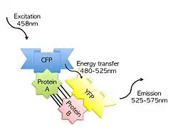 ![]() FRET: interaction between protein A and protein B brings the two fluorescent proteins together and energy transfer occurs between the two fluorescent proteins |