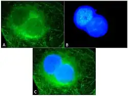 | A binucleated cell has two nuclei. The cell above was stained with DAPI to highlight the nuclei and treated with antibodies against tubulin to highlight the microtubules to show the binucleation. | |