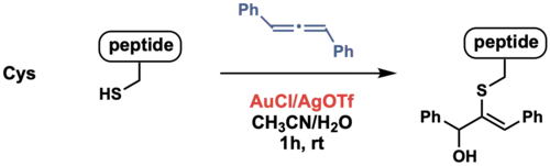 - ↑ Chan AO, Tsai JL, Lo VK, Li GL, Wong MK, Che CM (February 2013). "Gold-mediated selective cysteine modification of peptides using allenes". Chemical Communications. 49 (14): 1428–1430. doi:10.1039/c2cc38214h. PMID 23322001.