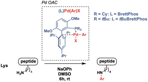 Similar to cysteine, lysine N-arylation could be achieved through Pd OACs with different dialkylbiaryl phosphine ligands. Due to weaker nucleophilicity and slower reductive elimination rate compared to cysteine, the selection of supporting ligands is shown to be critical. The bulky BrettPhos and t-BuBrettPhos ligands in conjunction with mildly basic sodium phenoxide have been used as the strategy to functionalize lysines on peptide substrates. The reaction happens in mild conditions and is selective over most other nucleophilic amino acid residues.