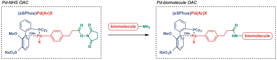 Alternate to directly oxidative addition to the peptide, the Pd OACs could also be transferred to the protein through amine-selective acylation reaction via NHS ester. The latter has been applied to selectively label surface lysine residues of a protein (forming PdII-protein OACs) and oligonucleotides (forming PdII-oligonucleotide OACs), which could then be linked to cysteine-containing peptides or proteins.[46]