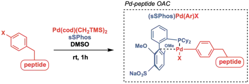Another example of protein-protein cross-coupling is achieved through converting cysteine residues into an electrophilic S-aryl–Pd–X OAC by utilizing an intramolecular oxidative addition strategy.[47]