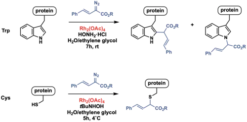 - ↑ Kundu R, Ball ZT (May 2013). "Rhodium-catalyzed cysteine modification with diazo reagents". Chemical Communications. 49 (39): 4166–4168. doi:10.1039/c2cc37323h. PMID 23175246.