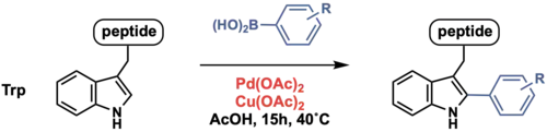 Multiple methods have been reported to achieve tryptophan C–H arylation, where diverse electrophiles such as aryl halides[38][39] and aryl boronic acids[40] (an example shown below) have been used to transfer the aryl groups.