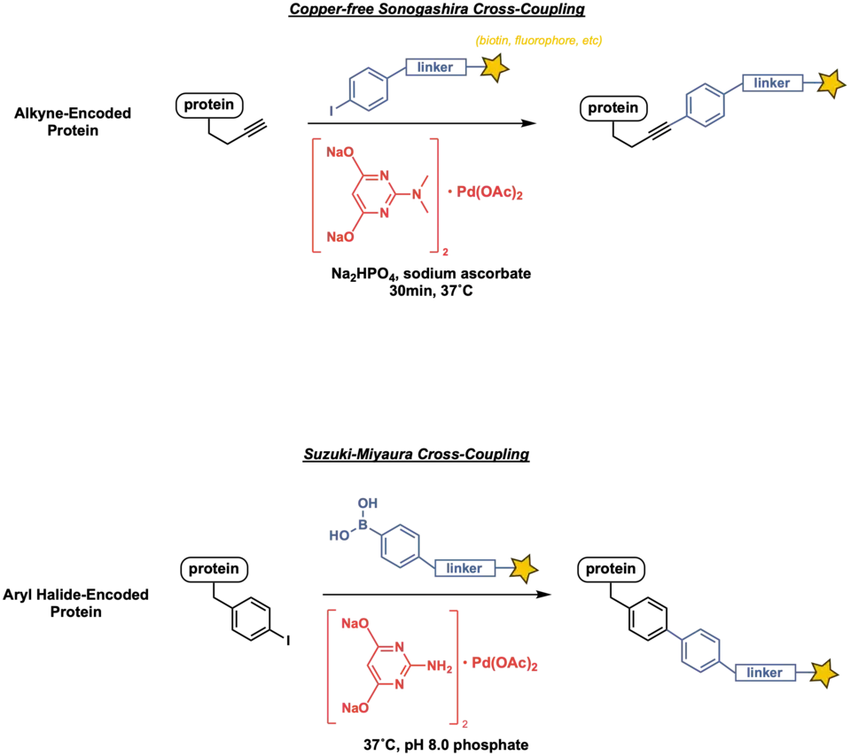 Pd-mediated Sonogashira, Heck, and Suzuki-Miyaura cross-coupling reactions have been applied widely to modify peptides and proteins, where diverse Pd reagents have been developed for the application in aqueous solutions.[49] Those reactions require the protein or peptide substrate bearing unnatural functional groups such as alkyne,[50][51][52] aryl halides,[53][54][55][56] and aryl boronic acids,[57] which can be achieved through genetic code expansion or post-translational modifications.