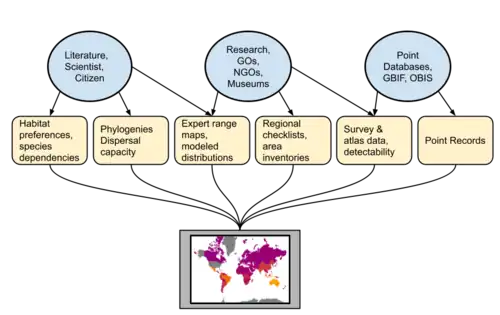 Biodiversity maps can be produced in a variety of ways: traditionally range maps were hand-drawn based on literature reports but increasingly large-scale data, e.g. from citizen science projects (e.g. iNaturalist) and digitized museum collections (e.g. VertNet) are used. GIS tools such as ArcGIS or R packages such as dismo can specifically aid in species distribution modeling (ecological niche modeling) and even predict impacts of ecological change on biodiversity.[13] GBIF, OBIS, and IUCN are large web-based repositories of species spatial-temporal data that source many existing biodiversity maps.