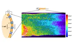 The vibrating ion-selective microelectrode was first used in 1990 to measure calcium fluxes in various cells and tissues.[63] The ion-selective microelectrode is an adaptation of the glass microelectrode, where an ion-specific liquid ion exchanger (ionophore) is tip-filled into a previously silanized (to prevent leakage) microelectrode. Also, the microelectrode vibrates at low frequencies to operate in the accurate self-referencing mode. Only the specific ion permeates the ionophore, therefore the voltage readout is proportional to the ion concentration in the measuring condition. Then, flux is calculated using the Fick's first law.[61][64]