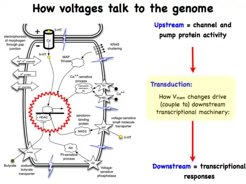 Life is ultimately an electrochemical enterprise; research in this field is progressing along several frontiers. First is the reductive program of understanding how bioelectric signals are produced, how voltage changes in the cell membrane are able to regulate cell behavior, and what the genetic and epigenetic downstream targets of bioelectric signals are. A few mechanisms that transduce bioelectric change into alterations of gene expression are already known, including the bioelectric control of movement of small second-messenger molecules through cells, including serotonin and butyrate, voltage sensitive phosphatases, among others.[206][207] Also known are numerous gene targets of voltage signaling, such as Notch, BMP, FGF, and HIF-1α.[128] Thus, the proximal mechanisms of bioelectric signaling within single cells are becoming well-understood, and advances in optogenetics[80][172][4][208][209] and magnetogenetics[210] continue to facilitate this research program. More challenging however is the integrative program of understanding how specific patterns of bioelectric dynamics help control the algorithms that accomplish large-scale pattern regulation (regeneration and development of complex anatomy). The incorporation of bioelectrics with chemical signaling in the emerging field of probing cell sensory perception and decision-making[211][212][213][214][215][216] is an important frontier for future work.