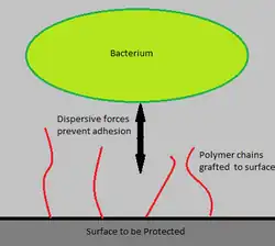 Dispersion forces between the polymer chains and the bacterial cells prevent bacteria from binding to the surface and initiating biofilm growth. The concept is similar to that of steric stabilization of colloids. Polymer chains are grafting to a surface via covalent bonding or adsorption. The solubility of these polymers stems from the high conformational entropy of polymer chains in solution. The Χ (Chi) parameter is used to determine whether a polymer will be soluble in a given solution. Χ is given by the equation: