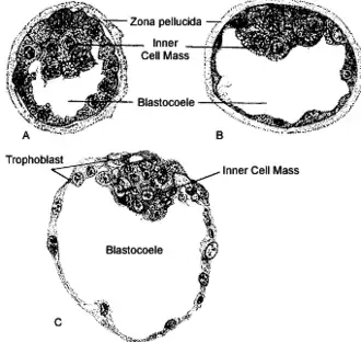 {{cite book}}: CS1 maint: location missing publisher (link) - ↑ Wiley, Lynn M. (1984). "Cavitation in the mouse preimplantation embryo: and the origin of nascent blastocoele fluid". Developmental Biology. 105 (2): 330–42. doi:10.1016/0012-1606(84)90290-2. PMID 6090240.