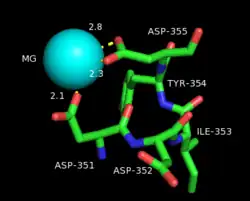 Bornyl diphosphate synthase is a homodimeric isomerase, with each of the two monomers containing two α-helical domains. In the case of BPPS, the C-terminal domain directly catalyzes the cyclization of geranyl diphosphate, as seen in the above reaction mechanism, while the N-terminal domain acts as a scaffolding to the active site of the C-terminal during the reaction.[1] The N-terminal domain forms similar α-barrels to that of other terpene cyclases such as epiaristolochene synthase and farnesyltransferase. In ligand complexes, such as with GPP, bornyl diphosphate synthase stabilizes the complex through multiple hydrogen bond interactions, specifically with aspartate-rich motifs.[1] Additionally, arginines in the N terminus may play a stabilizing role in the initial isomerization step of the reaction cascade discussed in the section above. The C-terminal domain, on the other hand, contains 12 α-helices, which define the hydrophobic active site where the cyclization occurs. Critical amino acid segments found in the C-terminal domain are also what allow the required magnesium metal ions to bind and allow the first pyrophosphate release. Specifically, this is accomplished by an aspartate-rich domain DDIYD beginning at D351, in with the boldface represents the residues directly interacting with the magnesium ion, elucidated on the adjacent image.[1][9]