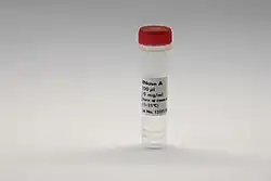 Bovine pancreatic ribonuclease, also often referred to as bovine pancreatic ribonuclease A or simply RNase A, is a pancreatic ribonuclease enzyme that cleaves single-stranded RNA. Bovine pancreatic ribonuclease is one of the classic model systems of protein science.[1] Two Nobel Prizes in Chemistry have been awarded in recognition of work on bovine pancreatic ribonuclease: in 1972, the Prize was awarded to Christian Anfinsen for his work on protein folding and to Stanford Moore and William Stein for their work on the relationship between the protein's structure and its chemical mechanism;[2] in 1984, the Prize was awarded to Robert Bruce Merrifield for development of chemical synthesis of proteins.[3]