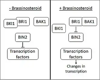 BRs are perceived at the cell membrane by a co-receptor complex, comprising brassinosteroid insensitive-1 (BRI1) and BRI1-associated receptor kinase 1 (BAK1).[16] BRI1 acts as a kinase, but in the absence of BR its action is inhibited by another protein, BRI1 kinase inhibitor 1 (BKI1). When BR binds to the BRI1:BAK1 complex, BKI1 is released, and a phosphorylation cascade is triggered which results in the de-activation of another kinase, brassinosteroid insensitive 2 (BIN2). BIN2 and its close homologues inhibit several transcription factors. The inhibition of BIN2 by BR releases these transcription factors to bind to DNA and to enact certain developmental pathways.[16]