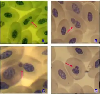- ↑ Fenech, M.; Kirsch-Volders, M.; Natarajan, A. T.; Surralles, J.; Crott, J. W.; Parry, J.; Norppa, H.; Eastmond, D. A.; Tucker, J. D. (1 January 2011). "Molecular mechanisms of micronucleus, nucleoplasmic bridge and nuclear bud formation in mammalian and human cells". Mutagenesis. 26 (1): 125–132. doi:10.1093/mutage/geq052. ISSN 0267-8357. PMID 21164193.