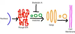 In mammalian and yeast cells, the main target of brefeldin A appears to be a guanine nucleotide exchange factor (GEF) called GBF1.[7] GBF1 is a member of the Arf family of GEFs which are recruited to membranes of the Golgi.[8] It is responsible for the regulation of Arf1p GTPase.[8] It does this through converting the inactive GDP-bound form of Arf1p to the active GTP-bound form.[8] The nucleotide exchange occurs at the catalytic Sec7 domain of GBF1. Activated Arf1p then recruits coat protein β-COP, a subunit of the COP-I complex, to cargo-bound receptors on the membrane.[8] Coat protein recruitment is necessary for proper vesicle formation and transport. Brefeldin A reversibly inhibits the function of GBF1 uncompetitively by binding to the complex it forms with GDP-bound Arf1p and preventing conversion to the GTP-bound form.[8] The lack of active Arf1p prevents coat protein recruitment, which then ultimately induces the fusion of neighboring ER and Golgi membranes due to lack of vesicle formation. This is because lack of vesicle formation results in a buildup of SNARE proteins in the Golgi which would otherwise be bound to coat protein-coated vesicles and removed with the vesicles once they bud off.[9] SNARE proteins mediate membrane fusion and it is postulated that the described SNARE build up in the Golgi increases the chances of aberrant fusion of the Golgi membrane with that of the ER.[9] The collapse of the Golgi into the ER triggers activation of unfolded protein response (UPR) (or ER stress)[10][11] which can result in apoptosis.