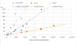 After performing a molecular clock analysis, C11orf49 has evolved at a faster rate than Cytochrome c but slower than Fibrinogen alpha. The graph containing this analysis is to the right of the page.