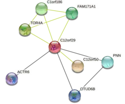 C12orf29 is a protein that in humans is encoded by chromosome 12 open reading frame 29. The gene is ubiquitously expressed in various tissues.[5] The protein has 325 amino acids. The biological process of C12orf29 has been annotated as hematopoietic progenitor cell differentiation.[6] The molecular and cellular functions of C12orf29 gene have not yet well understood by the scientific community.