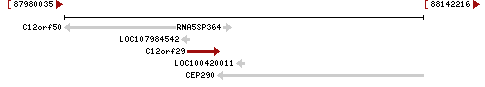 Neighbor genes around human C12orf29 are: C12orf50 (-), RNA5SP364 (+), LOC107984542 (-), LOC100420011 (+), CEP290 (-).