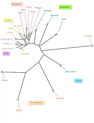 Orthologs of C12orf29 protein are found within the mammals, birds, reptiles, amphibians, fishes, and invertebrates.[21] The length and contents of the protein sequence was highly conserved in the selected orthologs (table below).[18] It is important to notice that the C12orf29 protein was only found in mollusks, tunicate, and cephalochordata in invertebrates, but it was not found in insects, arachnids, crustaceans, corals, worms, jellyfishes, sponges within the other groups in invertebrates.[17][22] C12orf29 protein was not found in bacteria, fungi, and viruses.[17] There is no paralog for C12orf29 protein.[17] The mutation rate of C12orf29 was close to that of fibrinogen alpha chain. The human's C12orf29 protein was more closely related to the sheep's ortholog than to the mouse's ortholog. The invertebrates C12orf29 orthologs were mostly distantly related to the human protein.