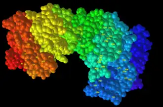 C13orf42 is a protein which, in humans, is encoded by the gene chromosome 13 open reading frame 42 (C13orf42). RNA sequencing data shows low expression of the C13orf42 gene in a variety of tissues.[3] The C13orf42 protein is predicted to be localized in the mitochondria, nucleus, and cytosol.[4] Tertiary structure predictions for C13orf42 indicate multiple alpha helices.[5]