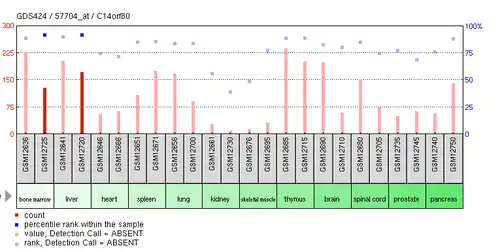 C14orf80 has been determined to be expressed in 77 types of tissues and 100 developmental stages.[8] It has also been determined to have a higher level of expression in a few cases of pancreatic and prostate cancer cells compared to normal tissue.[9]