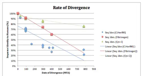 When compared to the slow-evolving cytochrome C gene and the fast-evolving fibrinogen gene, gene C14orf80 is also fast-evolving.[11]