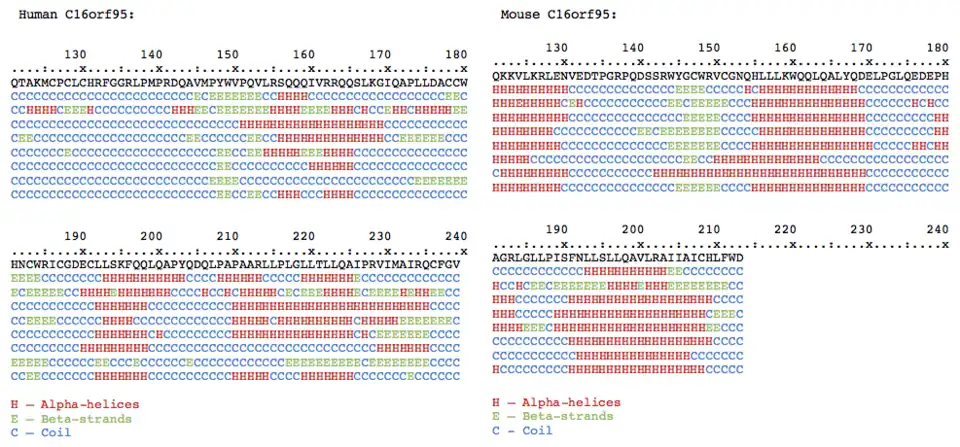 C16orf95 is predicted to have several alpha-helices in its C-terminus.[5] This is true for the human and mouse proteins. The N-terminus does not have significant cross-program consensus for secondary structure.