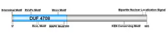 The protein contains one domain of unknown function, DUF 4709, spanning from the 7th amino acid to the 280th amino acid.[19] Motifs that are predicted to exist include an N-terminal motif, RxxL motif, and KEN conserving motif, which all signal for protein degradation.[20] Another motif that is predicted to exist is a Wxxx motif, which facilitates entrance of PTS1 cargo proteins into the organellar lumen, and a RVxPx motif which allows protein transport from the trans-Golgi network to the plasma membrane of the cilia.[21][22] There is also a bipartite nuclear localization signal at the end of the protein sequence.[23] There is no trans-membrane domain present, indicating that C18orf63 is not a trans-membrane protein.[24]
