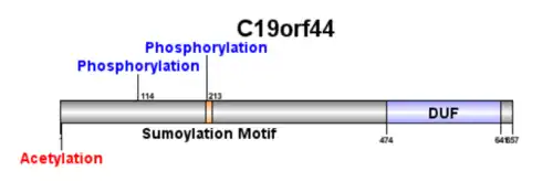 C19orf44 has experimentally determined phosphorylation sites at the S114 and S213 positions.[14] Other predicted post-translational modifications were found using tools on ExPASy[15] and are shown in the protein illustration below. N-terminal acetylation is predicted at S3. There is also a predicted sumoylation motif from amino acid 212 to 221.