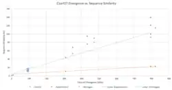 The m value, or number of corrected amino acid changes per 100 residues, for the C1orf27 gene was graphed against the species divergence in millions of years. When compared to divergence graphs of fibrinogen and cytochrome C, it was determined that this gene closely resembles the evolutionary pattern observed in fibrinogen, suggesting a more rapid rate of evolution. M values for C1orf27 were calculated using the percentage of identity, when compared to humans, observed in the mRNA sequences of the orthologs using the formula derived from the Molecular Clock Hypothesis.