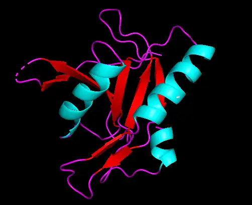 Alpha helices predicted in the c1orf27 protein are colored blue in the above picture. Beta sheets are pictured by the red arrows. Random coils are the purple strands between structures.