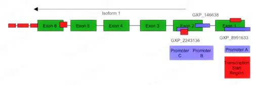 Transcription variant 3 has a size of 1706 bases and 6 exons.[12] This variant has an alternative spliced site in the coding region and differs in the 5’ UTR, but it still maintains the reading frame seen in transcript variant 1.[8] Despite their differences in size, variant 2 and variant 3 encodes the same protein isoform and this second protein isoform is shorted than the protein isoform encoded by transcript variant 1.