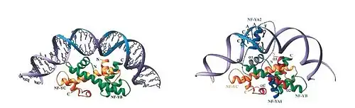 - ↑ Romier, Christophe; Cocchiarella, Fabienne; Mantovani, Roberto; Moras, Dino (24 October 2002). "The NF-YB/NF-YC Structure Gives Insight into DNA Binding and Transcription Regulation by CCAAT Factor NF-Y". The Journal of Biological Chemistry. 278 (2): 1336–1345. doi:10.1074/jbc.M209635200. PMID 12401788.