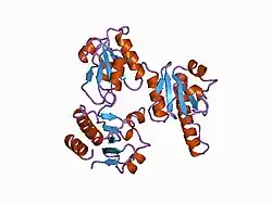 Calsequestrin is a calcium-binding protein that acts as a calcium buffer within the sarcoplasmic reticulum. The protein helps hold calcium in the cisterna of the sarcoplasmic reticulum after a muscle contraction, even though the concentration of calcium in the sarcoplasmic reticulum is much higher than in the cytosol. It also helps the sarcoplasmic reticulum store an extraordinarily high amount of calcium ions. Each molecule of calsequestrin can bind 18 to 50 Ca2+ ions.[1] Sequence analysis has suggested that calcium is not bound in distinct pockets via EF-hand motifs, but rather via presentation of a charged protein surface. Two forms of calsequestrin have been identified. The cardiac form Calsequestrin-2 (CASQ2) is present in cardiac and slow skeletal muscle and the fast skeletal form Calsequestrin-1(CASQ1) is found in fast skeletal muscle. The release of calsequestrin-bound calcium (through a calcium release channel) triggers muscle contraction. The active protein is not highly structured, more than 50% of it adopting a random coil conformation.[2] When calcium binds there is a structural change whereby the alpha-helical content of the protein increases from 3 to 11%.[2] Both forms of calsequestrin are phosphorylated by casein kinase 2, but the cardiac form is phosphorylated more rapidly and to a higher degree.[3] Calsequestrin is also secreted in the gut where it deprives bacteria of calcium ions.[4]