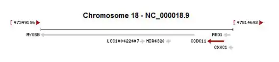 The below image from NCBI shows the gene neighborhood of CCDC11 on chromosome 18. CCDC11 has methyl-CPG binding domain protein 1, MBD1, upstream and myosin VB3, MYO5B, downstream. All CCDC11, MBD1 and MYO5B are oriented negatively. Note the close proximity between MBD1 and CCDC11.