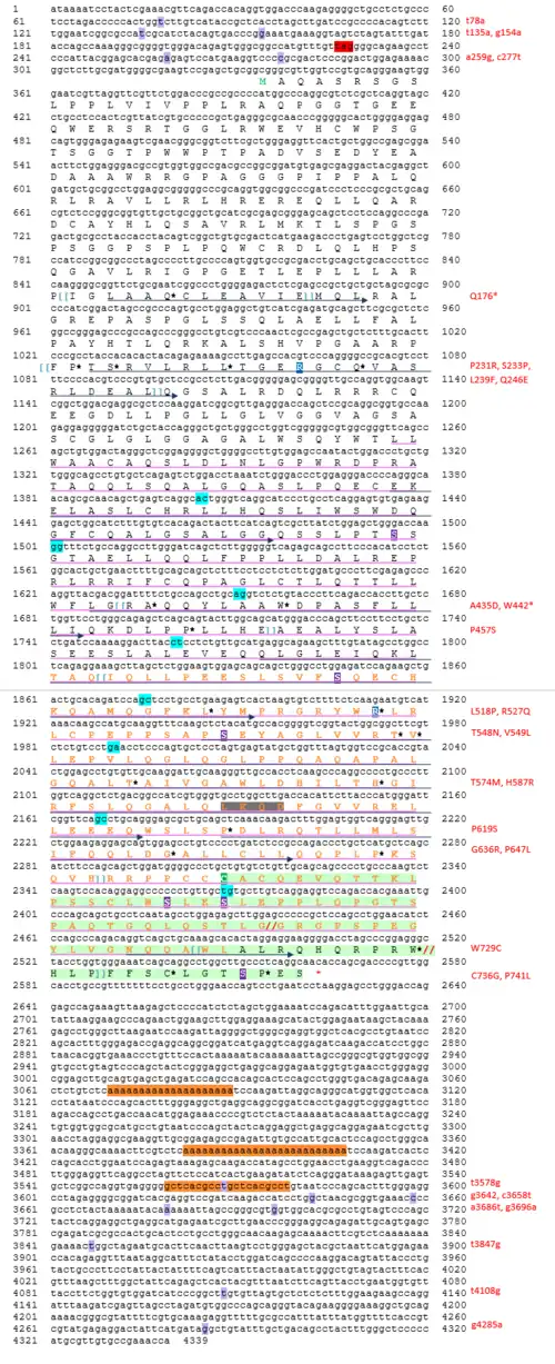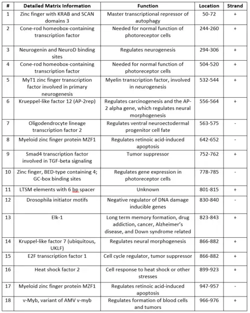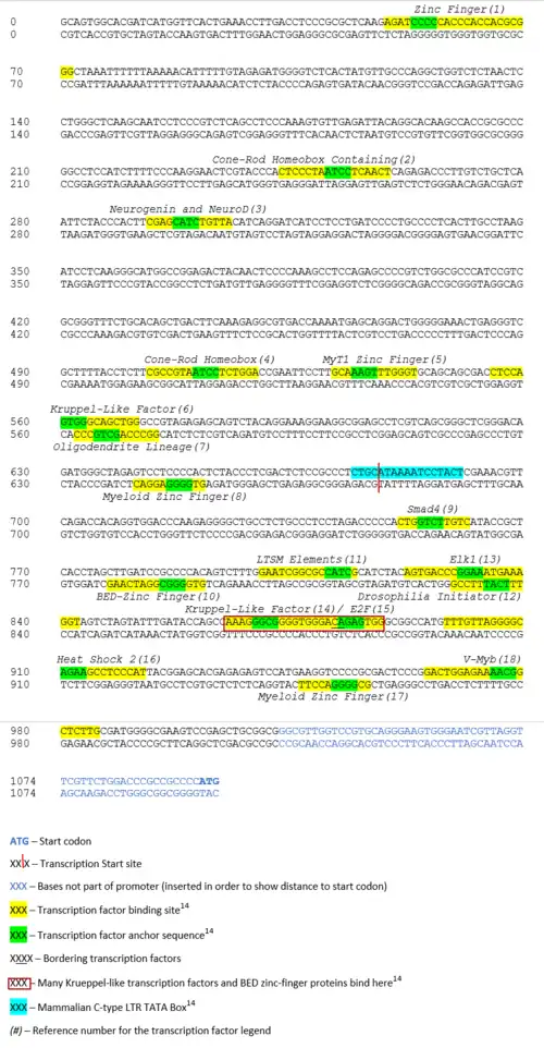 The promoter region for CCDC142 was identified using the El Dorado program at Genomatix, it spans bases 74482896–74483908 in chromosome 2.[14] This 1013bp region spans 1071–58bp upstream of the start codon of CCDC142.[14] There is a region in the promoter which binds a large number of Krueppel-like transcription factors and BED zinc-finger proteins.[14] This region has no single-nucleotide polymorphisms (SNPs) located in it.[15] Many of the transcription factors that bind to the promoter region of CCDC142 have functions dealing with tumor suppression, neurogenesis, DNA damage, and photoreception.[14] This promoter region also contains a mammalian C-type LTR TATA box which overlaps with the transcription start site of the gene.[14]