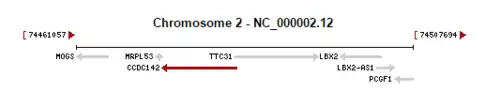 CCDC142 is found on the – strand of chromosome 2 (2p13.1), with the genomic sequence spanning bases 74,472,832 to 74,483,230.[1] The coding region is 8292 base pairs long, encoding for two protein isoforms 743 to 665 amino acids in length.[1] On the telomeric side, CCDC142 is followed by the MOGS and MRPL53 genes. On the centromeric side, it is followed by the C31, LBX2, LBX2-AS1, and PCGF1 genes.[1]