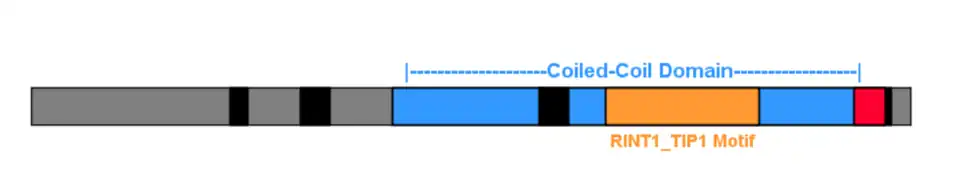 The predicted coiled-coil domain of CCDC142 is from amino acids 308–719.[2] A RINT1_TIP1 motif is also present from amino acids 490–621. RINT1_TIP1 is a family that includes RINT-1 (a protein involved in radiation-induced check point control) and TIP-1 (a yeast protein which is involved in Golgi transport).[4] The extra ~250 amino acids found in the distant ortholog CCDC142 proteins are not found in the Homo sapiens genome the near CCDC142 gene.