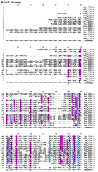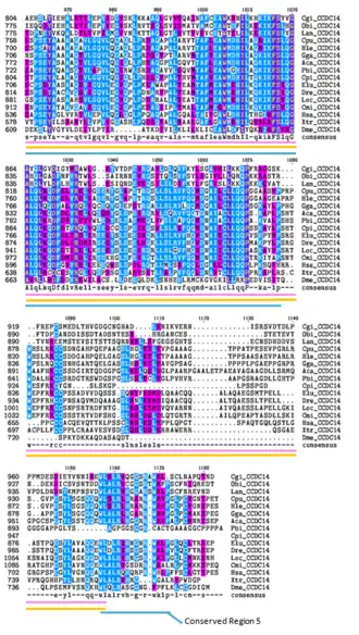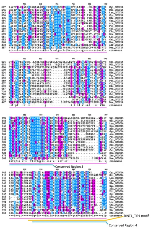 In the Multiple Sequence Alignment above (created using the CLUSTALW and TEXSHADE programs at SDSC Biology Workbench), organisms are labeled by the first letter of their genus and the first two letters of their species. The whole CCDC142 protein is highly conserved in mammals.[5] The regions containing the Homo sapiens coiled-coil domain and the RINT1_TIP1 motif region are highly conserved in distant homologs.[5] 12 of the 15 amino acids that match across all organisms in this region are nonpolar.[5] Conserved Region 1 contains mostly nonpolar amino acids.[5] Conserved Region 2 contains mostly nonpolar and basic amino acids. Conserved Region 3 contains both polar and nonpolar amino acids.[5] Conserved Region 5 contains mostly nonpolar and basic amino acids.[5]