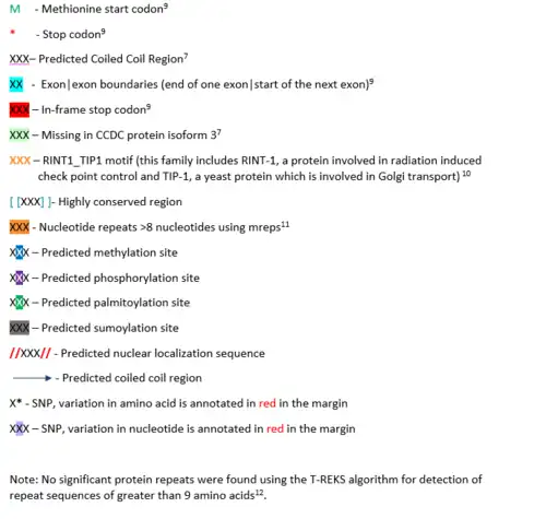 CCDC142 is predicted to have 6 phosphorylation sites, 4 methylation sites, 1 palmitoylation site, 1 sumoylation site, and 1 weak Nuclear Localization Signal.[6][7][8][9][10] These modifications indicate that CCDC142 is localized to the nucleus and cytosol. Refer to the Conceptual Translation for annotations of these sites in the protein.