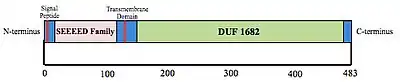 The protein encoded by CCDC47 is 483 amino acids in length and contains both a signal peptide and transmembrane domain. It is rich in negatively charged amino acids such as aspartic acid and glutamic acid giving it an acidic isoelectric point of 4.56.[7] The protein is also rich in methionine. In total, it weighs 55.9 kDal which is conserved through various orthologs. CCDC47 also contains the SEEEED superfamily and domain of unknown function 1682 (DUF1682). The SEEEED superfamily is a short, low complexity region which is composed mainly of serine. The family routinely lies on the clathrin adaptor complex 3 beta-1 subunit proteins.[8] The exact function of DUF 1682 is unclear but one member of the family has been described as an adipocyte-specific protein.[9]