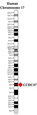 Coiled-coil domain 47 (CCDC47) is a gene located on human chromosome 17, specifically locus 17q23.3 which encodes for the protein PAT complex subunit CCDC47. The protein itself contains coiled-coil domains, the SEEEED superfamily, a domain of unknown function (DUF1682) and a transmembrane domain. The function of the protein is unknown, but it has been proposed that CCDC47 is involved in calcium ion homeostasis and the endoplasmic reticulum overload response.[5]