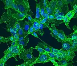 The protein encoded by this gene is a member of the transmembrane 4 superfamily, also known as the tetraspanin family. Most of these members are cell-surface proteins that are characterized by the presence of four hydrophobic domains. The proteins mediate signal transduction events that play a role in the regulation of cell development, activation, growth and motility. This encoded protein is a cell surface glycoprotein that is known to complex with integrins and other transmembrane 4 superfamily proteins. It is involved in cellular processes including cell adhesion and may regulate integrin trafficking and/or function. This protein enhances cell motility, invasion and metastasis of cancer cells. Multiple alternatively spliced transcript variants that encode the same protein have been described for this gene.[5] Abnormalities in CD151 have been implicated in a form of epidermolysis bullosa.[6][7]