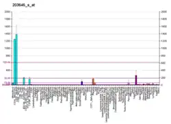 CD163 (Cluster of Differentiation 163) is a protein that in humans is encoded by the CD163 gene.[5] CD163 is the high affinity scavenger receptor for the hemoglobin-haptoglobin complex[6] and in the absence of haptoglobin - with lower affinity - for hemoglobin alone.[7] It also is a marker of cells from the monocyte/macrophage lineage.[8] CD163 functions as innate immune sensor for gram-positive and gram-negative bacteria.[9][10] The receptor was discovered in 1987.[11]